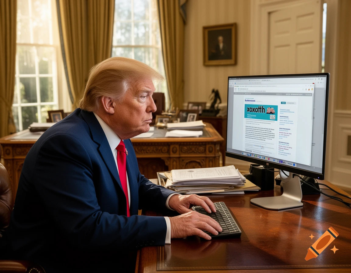 Trump hurriedly logging out of the bbooom account as someone knocks on his door